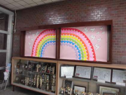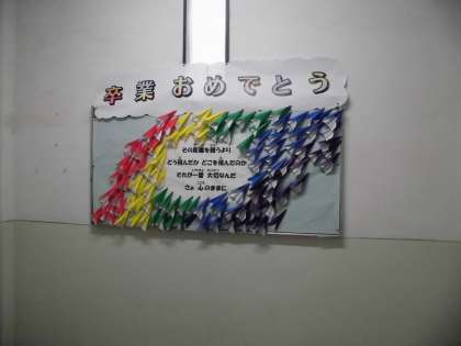 廊下や階段にはたくさんの学年から、6年生の卒業をお祝いする「卒業生に送る掲示」がされています。