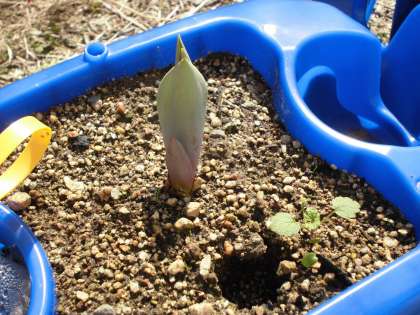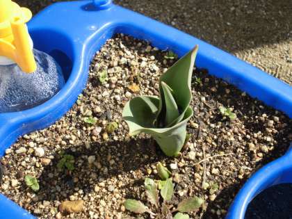 1年生が植えているチューリップの芽がどんどん大きく成長しています。春を感じます。