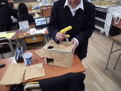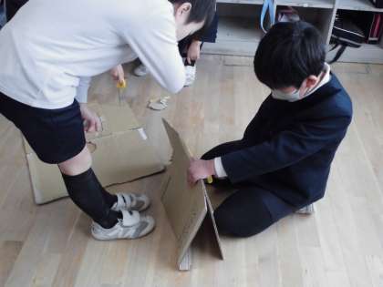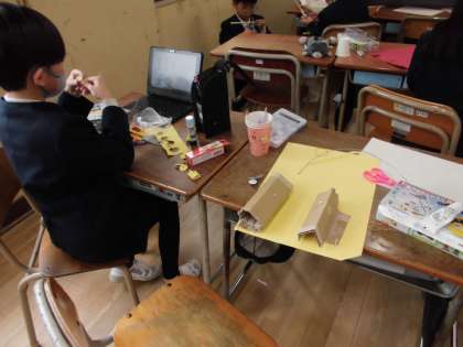 3年生は理科で磁石を使ったおもちゃ作りをしています。こちらのクラスも、楽しいおもちゃを作っています。段ボールを切って作る大掛かりな作品もあります。