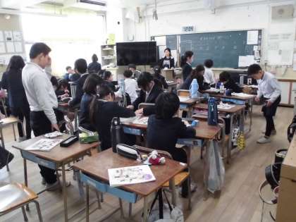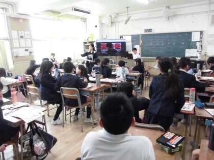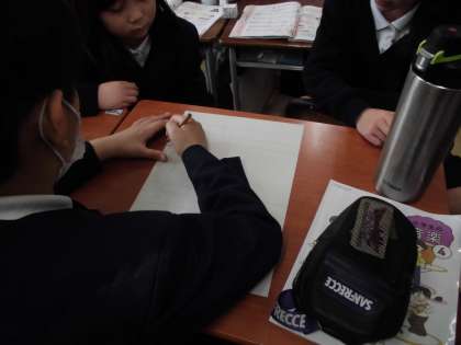 4年生は音楽でイントロクイズをしています。第一問で聞こえてきたのは「校歌」すごく小さな音ですが、グループで集中して聞いていました。アニメの曲や子どもたちが好きなはやりの曲が出ると、とても楽しそうに答えていました。