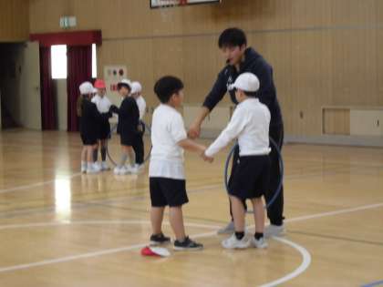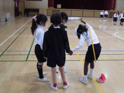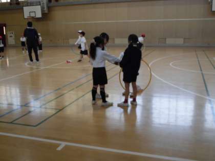 2年生は体育で輪を使ってゲームをしていました。数人で手をつないで輪をつないだ手の中に入れ、手を放さずに元の位置まで戻せるか挑戦するゲームです。「足上げて」など早く元の位置まで戻すことができるようにみんなで声を掛け合い、楽しく活動していました。