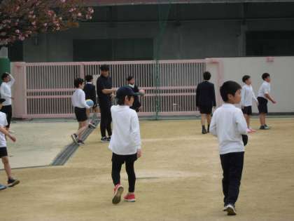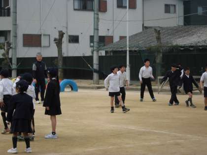 休み時間の様子です。子どもたちが元気に運動場で遊んでします。教員たちも休み時間には子どもたちと一緒に運動場に出て遊ぶ時間を大切にしています。「校長先生、休み時間、ドッジしよう。」子どもたちは校長先生も誘いに来ます。休み時間に校長室をのぞくと空っぽ。校長先生も、運動場で子どもたちと一緒にドッジボールをしていました。