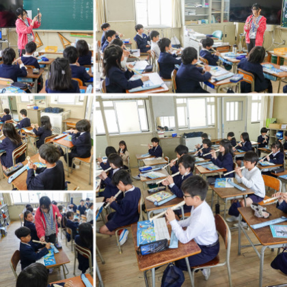 「リコーダーの持ち方」「指の押さえ方」「音の出し方」を教わって、「シ」の音を吹いてみました。吹きすぎると、「ピィーッ」と音が飛んでしまいます。優しい息づかいで、きれいな音が出せるように、練習あるのみ!