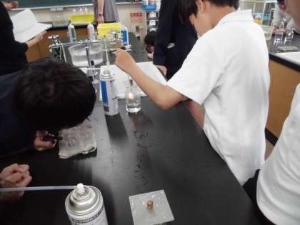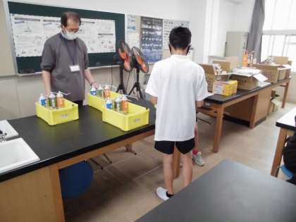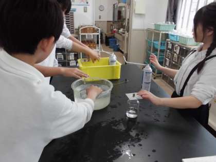 6年生は理科で「ものを燃やす働きのある気体」について学習しています。窒素、酸素、二酸化炭素の気体を集気びんに集めて、ろうそくの火の燃え方について実験しています。気体を集気びんに集めるところも難しいです。理科補助員の先生にも支援していただき、上手に集めて実験できました。