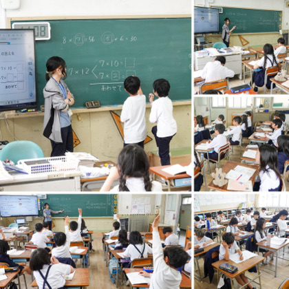 3時間目、算数の学習。「かけ算のきまり」を学習している子どもたち。そのしあげとして、まとめ・確認問題に取り組んでいました。