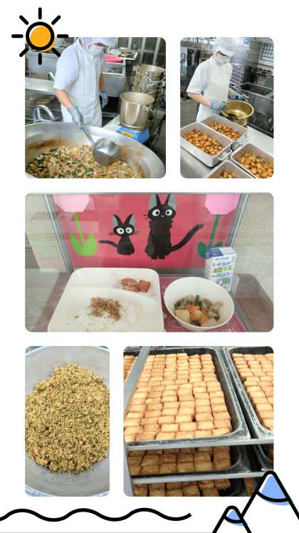 献立は、鶏肉とじゃがいもの煮もの・あつあげのしょうゆだれかけ・紅ざけそぼろ・ごはん・牛乳でした。