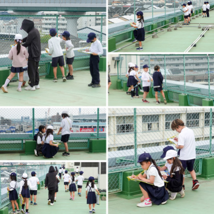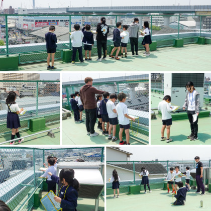 南校舎の屋上に上がって、校区のようすを観察しました。社会科の「わたしたちの町のようす」についての学習ですね。2組は4時間目に、1組は5時間目に上がりました。