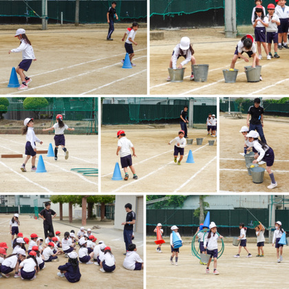 普通の50m走は、直線50mを一気に駆け抜けますが、今回は、指導するY先生の仕掛けがコースにちりばめられていました。スタート直後にボールの移し替えコーナーが。さらに、ゴールまでの間にコーン・フラフープ・木の箱が置かれていました。コーンのところでくるっとひと回りし、フラフープの位置に合わせて走り、木の箱を跳び越えます。