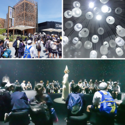予約時刻に合わせて、ハンガリー館へ。「自然と音楽」がテーマのハンガリー館、ドーム型のシアターで、ハンガリー民謡を聴きました。真ん中に、純白の民族衣裳に身を包んだ歌い手さん、天井からは無数のレーザー光が降り注ぎ、幻想的な雰囲気。「いっしょに歌いましょう」と促されて、最後みんなで合唱しました。