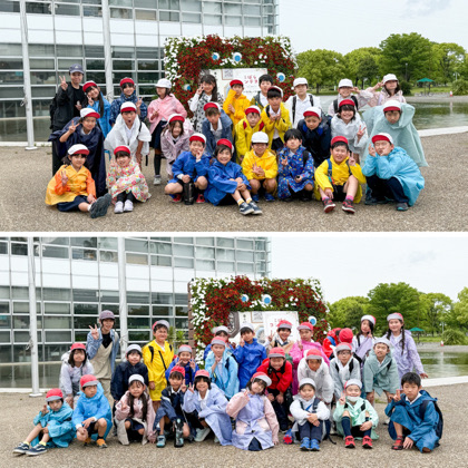 雨が本降りになる前に帰校するべく、予定よりも早く現地を出発し、13:30頃に無事帰校しました。上の写真は、現地出発直前に撮った集合写真です。