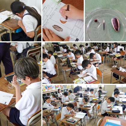 観察する種は、ヒマワリ・ホウセンカ・マリーゴールドの3種類。虫めがねを使って、形と色をしっかり観察し、ワークシートに描いていきます。大きさは、定規で測りました。手触りはどうでしたか?