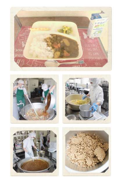 カレーライスには、ドライパックの大豆を使用しています。ドライパックの大豆は、蒸してあるので、大豆本来の甘みや旨みを味わうことができます。