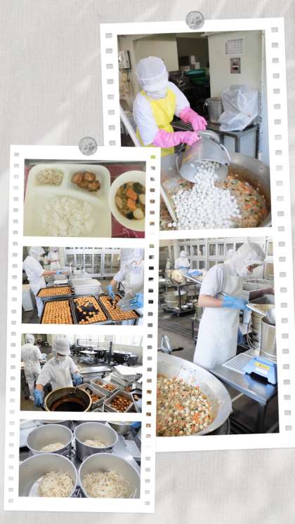 八宝菜の「八宝」は、たくさんの材料を集めて作ったという意味です。給食では、豚肉・うずら卵・キャベツ・にんじん・たまねぎ・たけのこ・ピーマン・しいたけを使用し、とろみをつけて仕上げています。