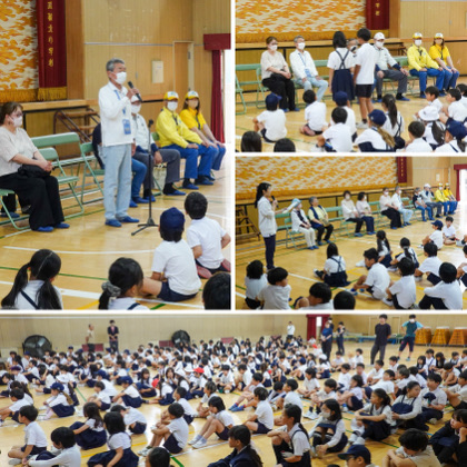 来てくださったのは、地域の見守り隊の方々や、平野区CAT隊(平野区地域安全まちづくり担当)の方々です。児童を代表して、2人の児童がお礼の言葉を伝えました。見守り隊の代表の方は、「交通ルールを守って、元気に登校してくださいね。毎朝のみなさんとの挨拶を、とても楽しみにしていますよ」と話してくださいました。