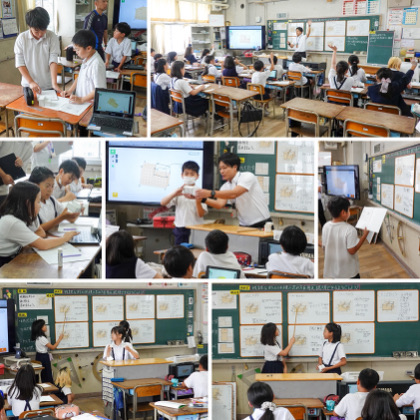 5時間目、5年生で教員対象の研究授業(教員の研修)が行われました。今年度の本校の研究教科である、算数科の授業です。習熟度別少人数学習として、3教室に分かれて授業が行われていました。
