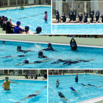 水慣れをした後、「けのび」の練習をしていました。壁を蹴って、浮いた状態で前に進みますが、そのときの姿勢が大事!「身体をまっすぐ、一直線にして!」とO先生。T先生がお手本を見せてくれました。