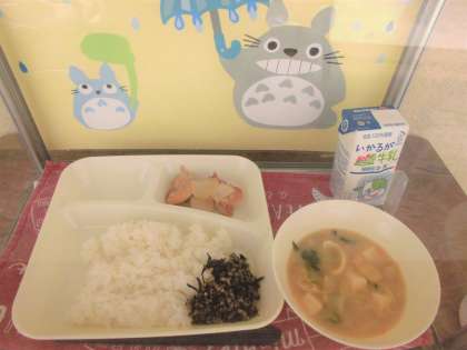 献立は、鶏肉の甘辛焼き・みそ汁・魚ひじきそぼろ・ごはん・牛乳でした。