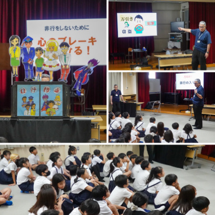 職員の方は、万引き・夜遊び・喫煙・飲酒といった非行の重大さや危険性、犯罪に巻き込まれないための行動、スマートフォンを使う上での注意点、ルールを守ることの大切さについてなど、映像と紙芝居で分かりやすく説明をしてくださいました。