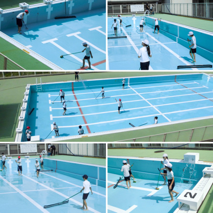 汗だくでの作業。運動委員会のみなさん、そして先生方、お疲れ様でした。清掃直後のプールは、また一段ときれいです!