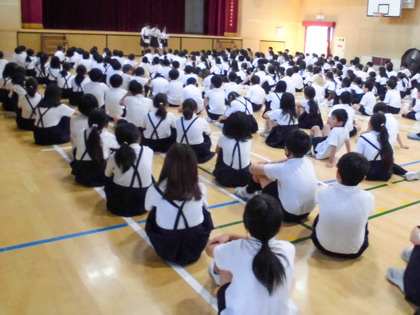 体育館で全校朝会が行われました。校長先生からは、4つのお話がありました。