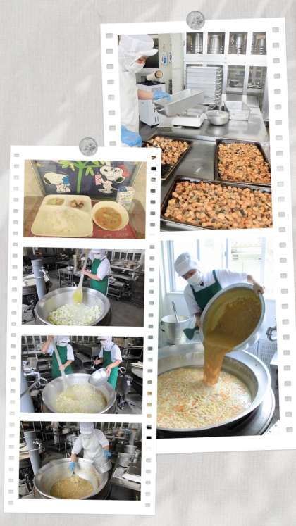 給食のとうがんの煮ものは、しょうがの風味をきかせただしで、鶏肉ととうがんを煮ています。
