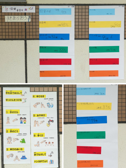 この1週間「給食前・掃除の後に、手洗いができたか」「ハンカチを持ってきたか」についてアンケートした結果を、学年ごとにグラフで表していました。給食前の手洗いできた率は88%〜98%、掃除後の手洗いできた率は75%〜96%、ハンカチ持ってきた率は64%〜83%でした。