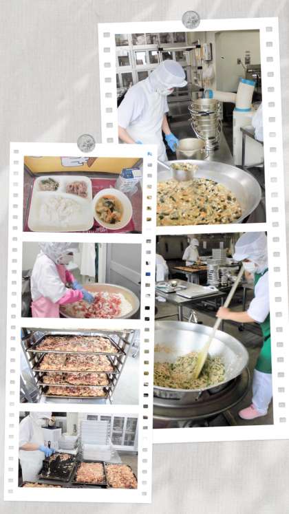 豚肉のしょうが焼きは、豚肉にしょうが汁・砂糖・みりん・こいくちしょうゆ・綿実油で下味をつけ、たまねぎを混ぜ合わせて焼き物機で焼いています。
