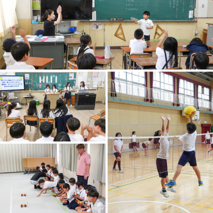 6年1組は、体育館でソフトバレーボール。マルチルームでは、3年2組児童による「ゴムで動くプロペラカーを、ゴールにぴったり止める選手権」が開催されていました。