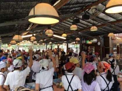 モクモク手作りファームに着き、ソーセージ作りにとりかかりました。美味しいソーセージになるように、みんなで協力して作っています。味は、お家に帰ってからのおたのしみです。