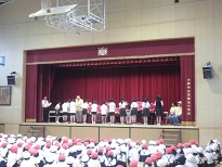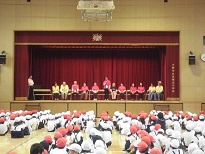 今日の児童集会では、日頃お世話になっている地域の見守り隊のみなさんと平野CAT隊の方に来ていただきました。