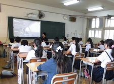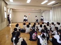 中学校の生徒会の人からあいさつや諸注意を受けた後、授業体験をしました。1組は社会科、2組は技術科の授業を受けました。その後、いろいろな部活動の見学をし、最後に吹奏楽部の演奏を聴きました。