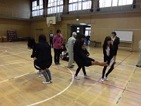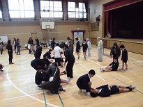 初めにDVDを見て、地震や津波が発生した時にどのように行動するべきかを学習しました。その後、消火活動に伴うバケツリレーや道具を使わずに行う3種類の救護訓練を行いました。
