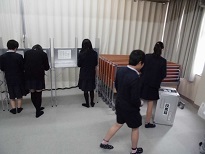 選挙とはどんなもので何のためにするのか、投票はどのようにするのかについて、クイズを交えながら教えていただきました。その後は、実際に選挙の際に用いられる道具を使いながら、模擬投票を行いました。自分たちのくらしのことを決めるのに、自分の1票が大切なことを学ぶことができました。