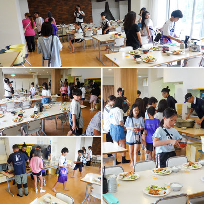 まもなく夕食です。ここで食事係の出番! 15分前に食堂に集合し、ごはんや汁物の配膳をしたり、お茶を入れたりしていました。仕事きっちり!