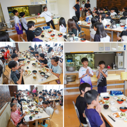 宿舎内の食堂で食べる、最初の食事です。S先生から、食器の返し方やおかわりについて説明がありました。食事係の代表が前に出てきて「いただきます!」