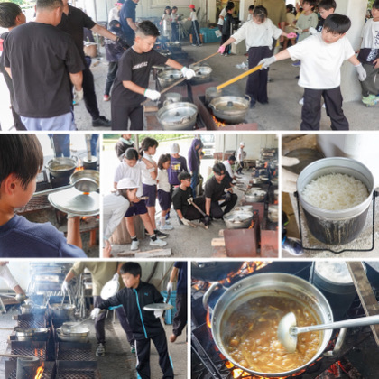 飯ごうは、炊きあがりのサインを見落とさないように、ふたの上に棒を置き、中の様子を探ります。大鍋は、ニンジンをお玉で切ってみて、火の通り具合を確認します。