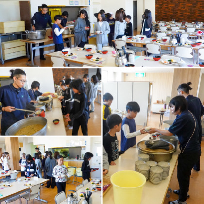 朝のつどい後、食事係はすぐに食堂へ。7:30からの朝食に間に合うように、配膳等を行っていました。おなじみの光景です。