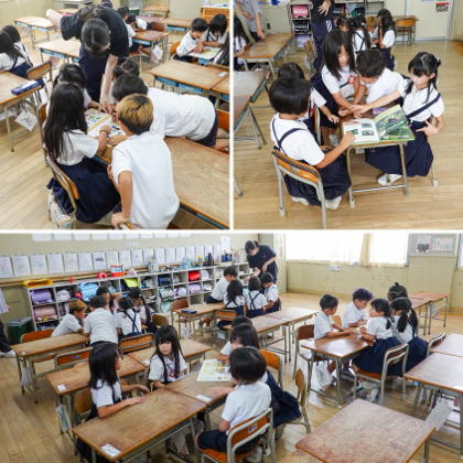 バッタやダンゴムシ等のすみかや食べ物などを、図鑑で調べる子どもたち。班でワイワイと。