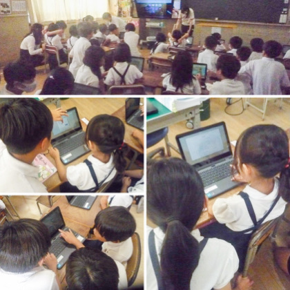 1年生のとなりに6年生がついて「こうするよ」と優しく声をかけながら教えたり、いっしょに操作したりする姿が、とても頼もしかったです。
