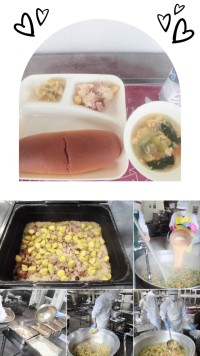 チキンカレーライスは、鶏肉・にんにく・にんじん・たまねぎ・じゃがいも・グリンピースを使用し、毎回児童に好評な献立です。
