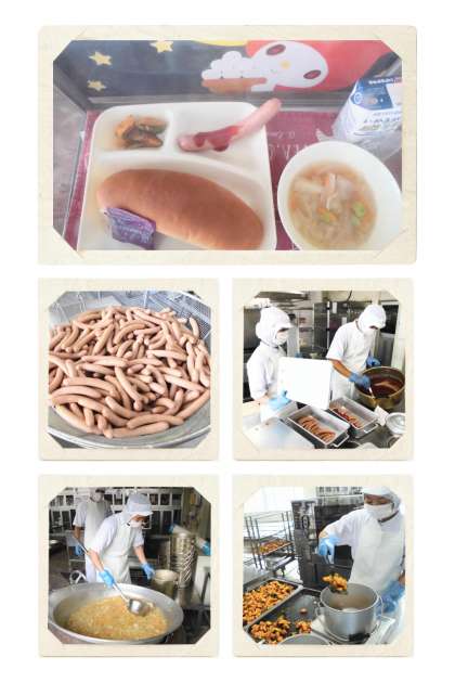ウインナーのケチャップソースは、ゆでたウインナーに砂糖・ケチャップ・トンカツソース・ウスターソース・でんぷんで作ったソースをかけています。