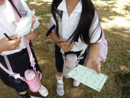 お弁当が終わると、みんなでフィールドワークをしました。自然に関するビンゴカードをもって、長居公園の自然観察をしました。「見つけたよ。」「見てみて。」という声があちこちから聞こえてきました。