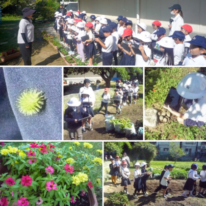 園庭には、野草園やビオトープがあり、果樹や花、虫など、たくさんの秋の生き物や植物に出会うことができました。