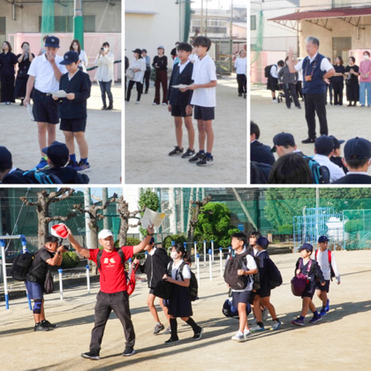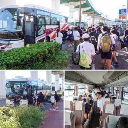 7:40から運動場で出発式を行い、バス乗り場まで移動。バスは8:15に出発しました。
