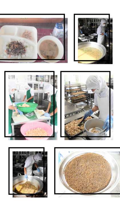 給食のジューシーは、豚ひき肉・もずく・切りこんぶなどを使用した炊き込みご飯風です。