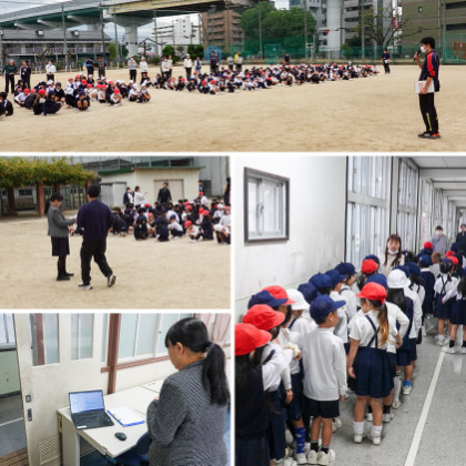 10:50、地震発生。机の下に避難した後、揺れがおさまったタイミングで運動場へ避難。その後「大阪市内に津波警報が発令された。津波が来る恐れがあるため、校舎の3階以上に避難する」ということで、校舎3,4階の教室・ろうかに避難しました。2段階の避難行動となりましたが、避難と人数確認は、スムーズにできたと思います。