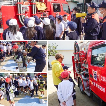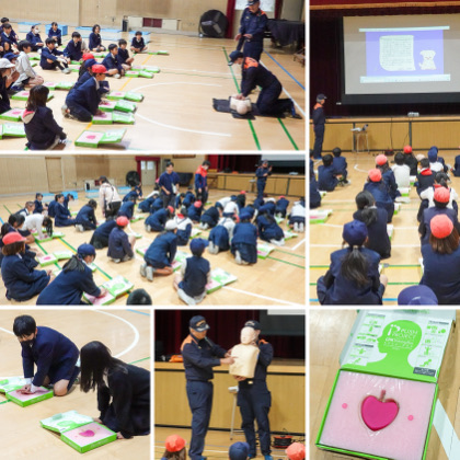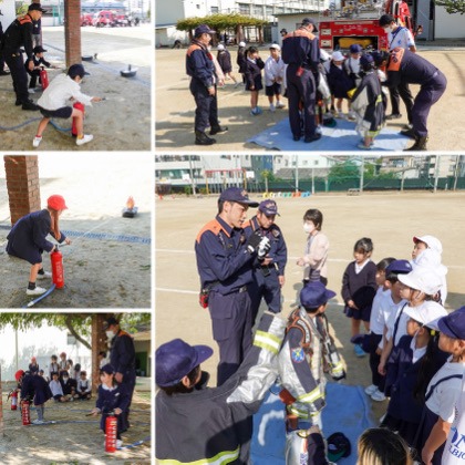 避難訓練後、2年生と5年生は防災訓練を行いました。2年生は、消火器を使った消火訓練と消防車見学、5年生は、胸骨圧迫(心臓マッサージ)の訓練です。(3年生も、消防車を見せていただきました)