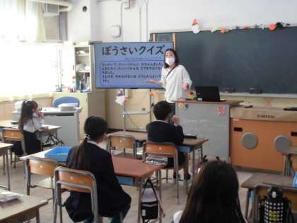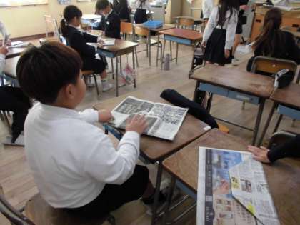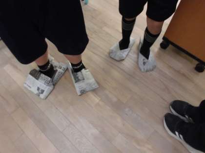 2年生は、土曜授業で森ノ宮医療大学の福島先生よりご提供いただいた資料をもとに、防災学習を行いました。災害時には学校の講堂などが避難所に使われ、寒い中過ごさなければなりません。寒さをしのぐ道具として考えられるものを発表して、新聞紙も寒さをしのぐものとして使えるよということを知りました。そこで、「新聞紙で防災スリッパを作ってみよう」と、作り方を学習しました。出来上がったスリッパをはいて子どもたちは「簡単に作れたよ」「ほんとにあったかい」「お家でも作ってあげる」と話していました。災害時に実用できる学習になりました。
