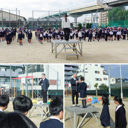 運動場で全校朝会が行われました。校長先生からは、12月に行われる音楽鑑賞会についてのお話がありました。
