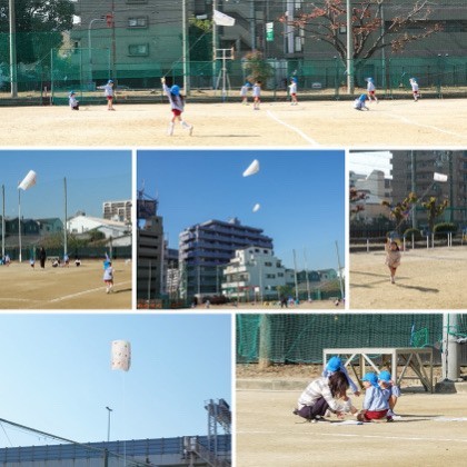 給食時間、瓜破北幼稚園の子どもたちが、運動場でたこ上げをしました。